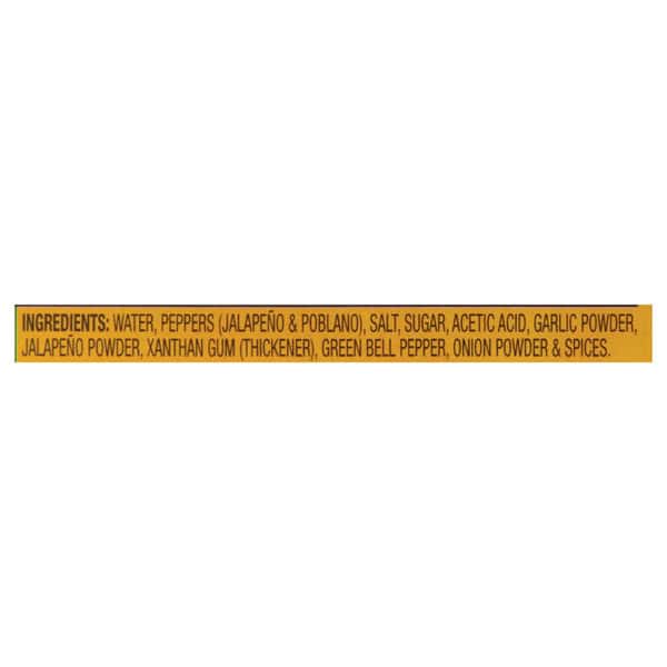 Water, Peppers (jalapeño & Poblano), Salt, Sugar, Acetic Acid, Garlic Powder, Jalapeño Powder, Xanthan Gum (thickener), Green Bell Pepper, Onion Powder, Spices