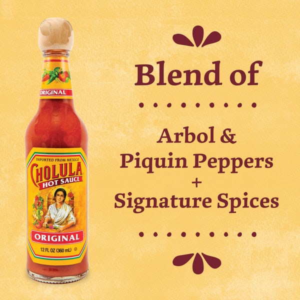 Cholula Original Hot Sauce is crafted from a generations-old family recipe that features arbol and piquin peppers, with a signature blend of spices, to deliver Mexican hot sauce heat and flavor.