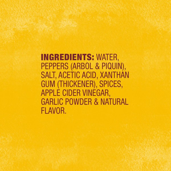 Water, Peppers (arbol & Piquin), Salt, Acetic Acid, Xanthan Gum (thickener), Spices, Apple Cider Vinegar, Garlic Powder & Natural Flavor.