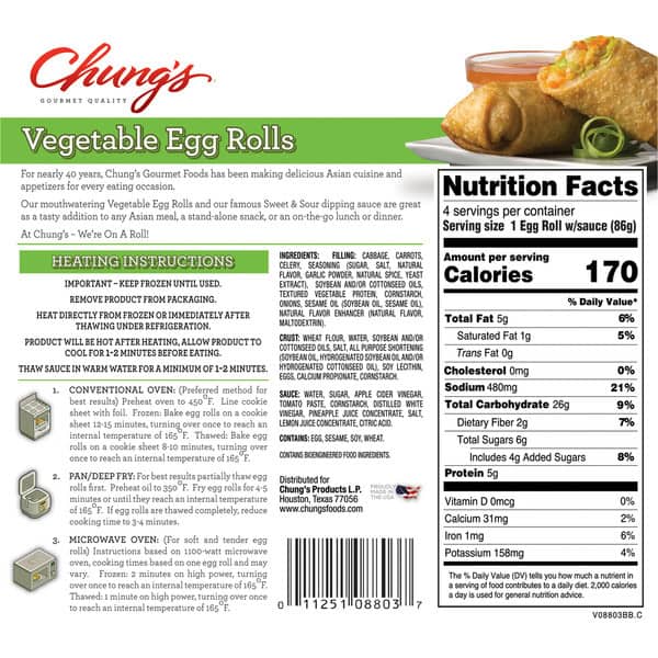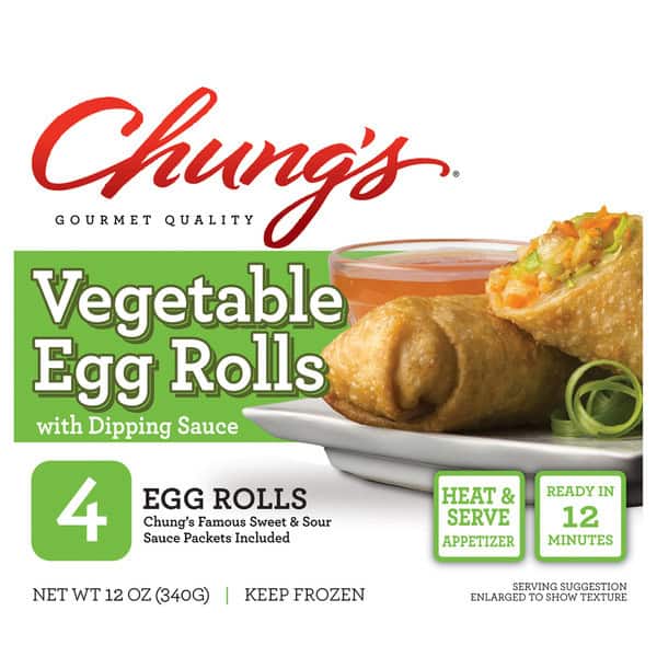 Gourmet quality. Chung’s famous sweet & sour sauce packets included. Heat & serve appetizer. Ready in 12 minutes. With sauce packets. Heat & serve appetizer. For nearly 40 years, Chung’s gourmet foods has been making delicious Asian cuisine and appetizers for every eating occasion. Our mouthwatering vegetable egg rolls are great as a tasty addition to any Asian meal, a stand-alone snack, or an on-the-go lunch or dinner. At Chung’s – we’re on a roll!