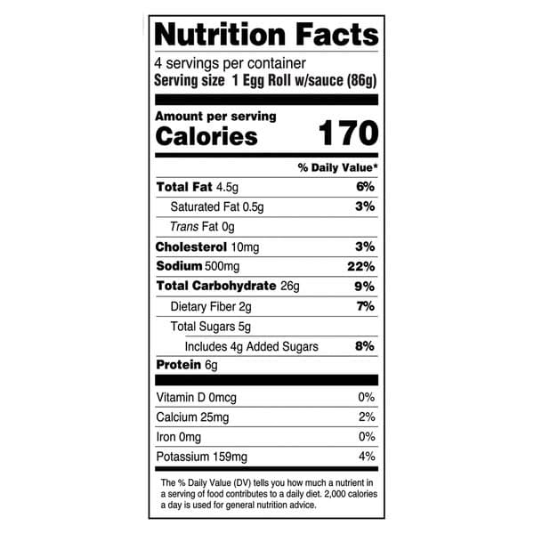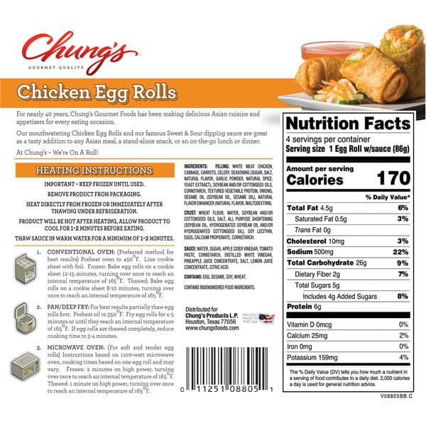 Heating Instructions: Important – keep frozen until used. Remove product from packaging. Heat directly from frozen or immediately after thawing under refrigeration. Product will be hot after heating, allow product to cool for 1-2 minutes before eating. Thaw sauce in warm water for a minimum of 1-2 minutes. 1. Conventional Oven: (Preferred method for best results) Preheat oven to 450 degrees F. Line cookie sheet with foil. Frozen: Bake egg rolls on a cookie sheet 12-15 minutes, turning over once to reach an internal temperature of 165 degrees F. Thawed: Bake egg rolls on a cookie sheet 8-19 minutes, turning over once to reach an internal temperature of 165 degrees F. 2. Pan/Deep Fry: For best results partially thaw egg rolls first. Preheat oil to 350 degrees F. Fry egg rolls for 4-5 minutes or until they reach an internal temperature of 165 degrees F. If egg rolls are thawed completely, reduce cooking time to 3-4 minutes. 3. Microwave Oven: (For soft and tender egg rolls) Instructions based on 1100-watt microwave oven, cooking times based on one egg roll and may vary. Frozen: 2 minutes on high power, turning over once to reach an internal temperature of 165 degrees F. Thawed: 1 minute on high power, turning over once to reach an internal temperature of 165 degrees F.