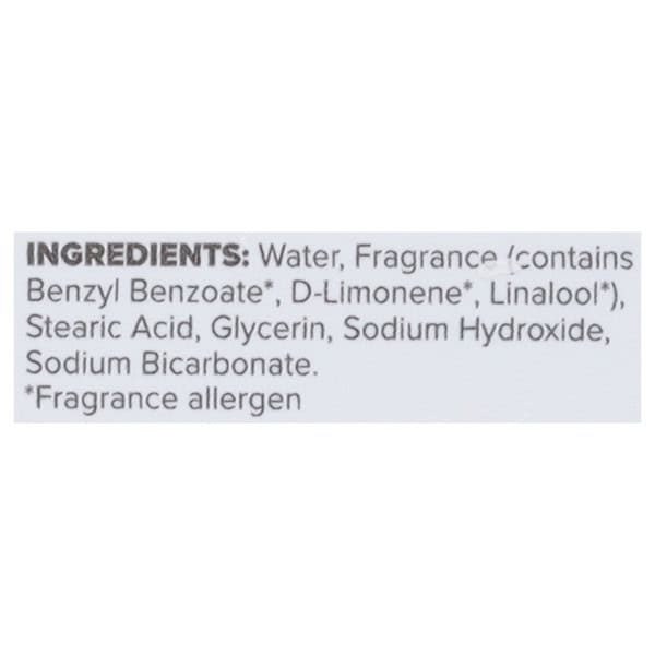 Water, Fragrance (Contains Benzyl Benzoate*, D-Limonene*, Linalool*), Stearic Acid, Glycerin, Sodium Hydroxide, Sodium Bicarbonate. * Fragrance Allergen.