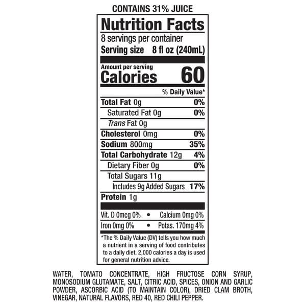 Water, Tomato Concentrate, High Fructose Corn Syrup, Monosodium Glutamate, Salt, Citric Acid, Spices, Onion And Garlic Powder, Ascorbic Acid (to Maintain Color), Dried Clam Broth, Vinegar, Natural Flavors, Red 40, Red Chili Pepper