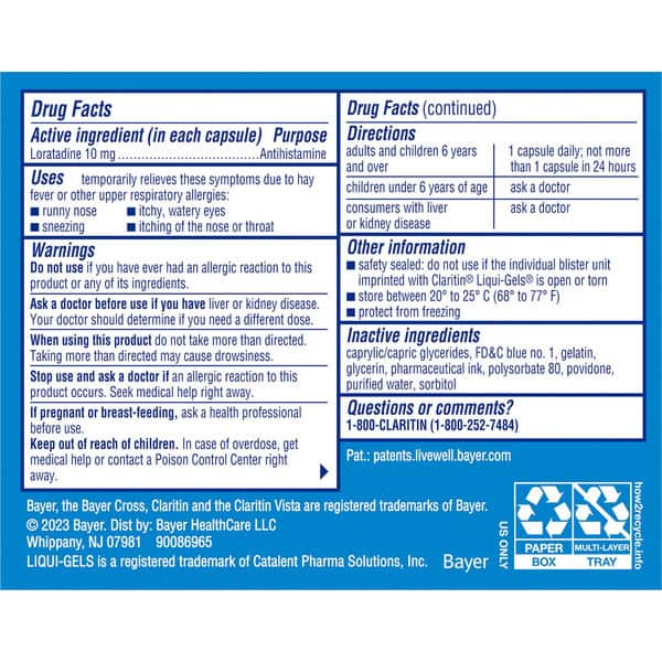 In Each Capsule Other Information: Safety Sealed: Do not use if the individual blister unit imprinted with Claritin Liqui-Gels is open or torn. store between 20 to 25 degrees C (68 to 77 degrees F). Protect from freezing.