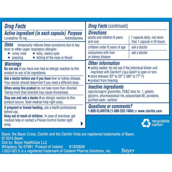 In Each Capsule: Other Information: Safety Sealed: Do not use if the individual blister unit imprinted with Claritin Liqui-Gels is open or torn. Store between 20 degrees to 25 degrees C (68 degrees to 77 degrees F). Protect from freezing. Loratadine 10 mg/antihistamine. Non-drowsy (when taken as directed. See Drug Facts panel). Relief of: Sneezing. Runny nose. Itchy, watery eyes. Itchy throat or nose. 10 capsules for 10 days of relief. www.claritin.com. Questions or comments? 1-800-Claritin (1-800-252-7484) or www.claritin.com. Recyclable carton. Product of Ireland.