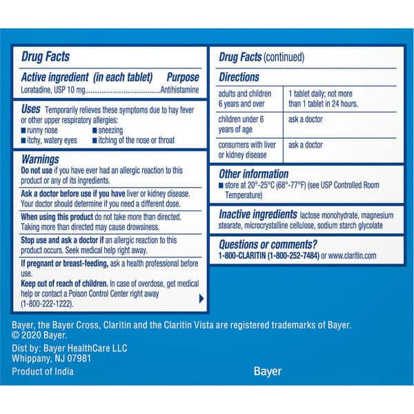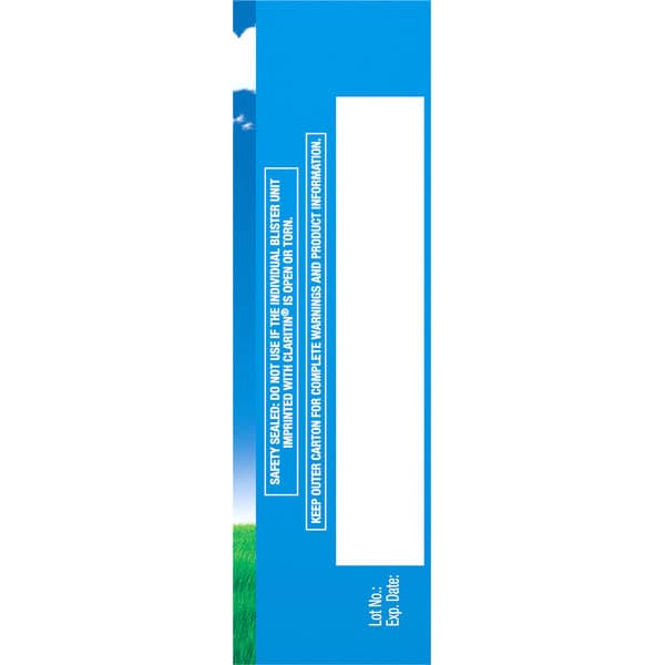 In Each Tablet: Warnings: Do not use if you have ever had an allergic reaction to this product or any of its ingredients. Ask a doctor before use if you have liver or kidney disease. Your doctor should determine if you need a different dose. When using this product do not take more than directed. Taking more than directed may cause drowsiness. Stop use and ask a doctor if an allergic reaction to this product occurs. Seek medical help right away. If pregnant or breast-feeding, ask a health professional before use. Keep out of reach of children. In case of overdose, get medical help or contact a Poison Control Center right away (1-800-222-1222). Safety Sealed: Do not use if the individual blister unit imprinted with Claritin is open or torn.