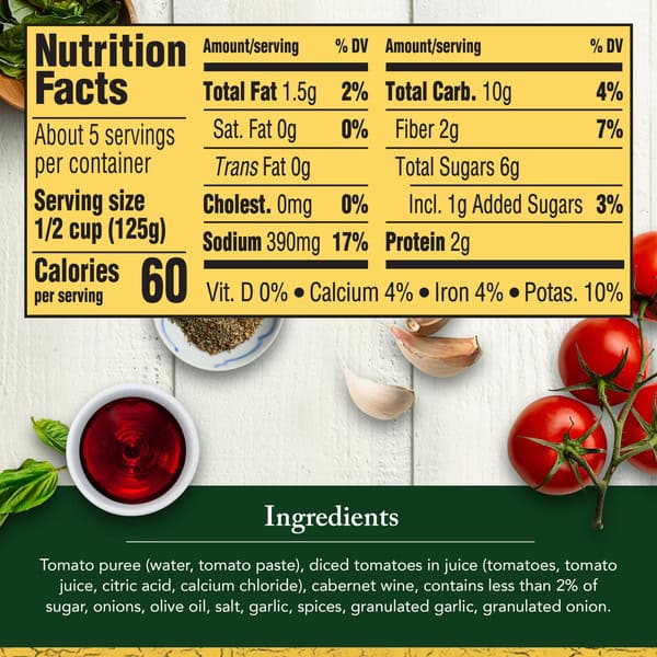 Tomato Puree (water, Tomato Paste), Diced Tomatoes In Juice (tomatoes, Tomato Juice, Citric Acid, Calcium Chloride), Cabernet Wine, Contains 2% Or Less Of: Onions, Sugar, Salt, Soybean Oil, Olive Oil, Garlic, Spices, Granulated Garlic, Granulated Onions.