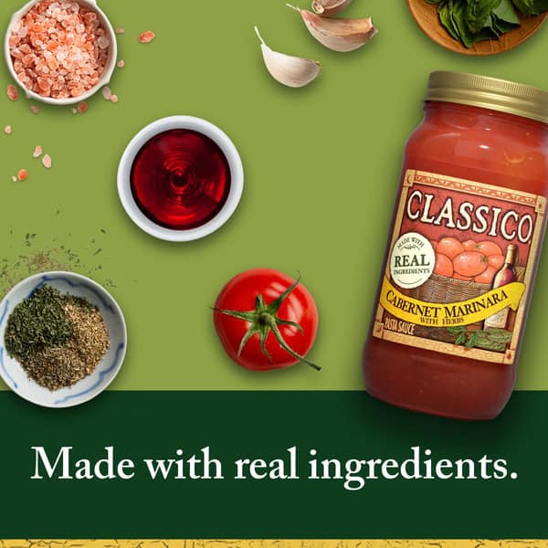 A splash of Cabernet wine is the secret ingredient to add warmth and care to your next homemade dish. Create your next homemade meal with Classico Cabernet Marinara with Herbs Pasta Sauce. Our sauce is easy to prepare and offers a rich, flavorful taste. Made with real ingredients, our sauce has a hearty flavor. Simply simmer and serve our sauce with your favorite meal. Use our red sauce for spaghetti, chicken Parmesan, lasagna or grilled chicken pasta. You can even try our sauce as a pizza sauce for homemade pizza or a dipping sauce for garlic bread. Be sure to refrigerate our 24-ounce jar of sauce after opening. Classico pasta sauce has a flavor for everyone in your family, from Cabernet Marinara with Herbs Pasta Sauce to Vodka Sauce Pasta Sauce. Make it yours, for your homemade dish.