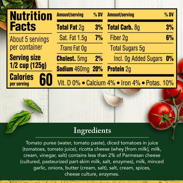 Tomato Puree (water, Tomato Paste), Diced Tomatoes In Juice (tomatoes, Tomato Juice), Ricotta Cheese (whey [from Milk], Milk, Cream, Vinegar, Salt), Contains Less Than 2% Of Parmesan Cheese (cultured Pasteurized Part-skim Milk, Salt, Enzymes), Milk, Minced Garlic, Onions, Butter (cream, Salt), Salt, Cream, Spices, Cheese Culture, Enzymes, Citric Acid.