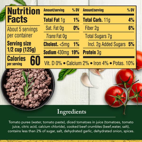 Tomato Puree (water, Tomato Paste), Diced Tomatoes In Juice (tomatoes, Omato Juice, Citric Acid, Calcium Chloride), Cooked Beef Crumbles (beef, Water, Salt), Contains Less Than 2% Of Sugar, Salt, Dehydrated Garlic, Dehydrated Onion, Spices.