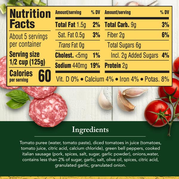 Tomato Puree (water, Tomato Paste), Diced Tomatoes In Juice (tomatoes, Tomato Juice, Citric Acid, Calcium Chloride), Green Bell Peppers, Cooked Italian Sausage (pork, Spices, Salt, Sugar, Garlic Powder), Onions, Water, Contains Less Than 2% Of Sugar, Garlic, Salt, Olive Oil, Spices, Citric Acid, Granulated Garlic, Granulated Onion.