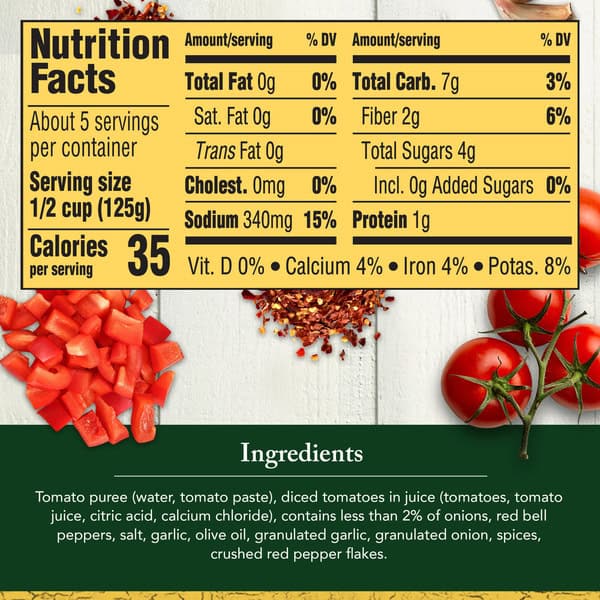 Tomato Puree (water, Tomato Paste), Diced Tomatoes In Juice (tomatoes, Tomato Juice, Citric Acid, Calcium Chloride), Contains Less Than 2% Of Onions, Red Bell Peppers, Salt Garlic, Olive Oil, Granulated Garlic, Granulated Onion, Spices, Crushed Red Pepper Flakes.