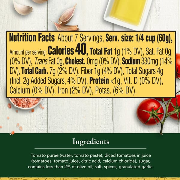 Tomato Puree (water, Tomato Paste), Diced Tomatoes In Juice (tomatoes, Tomato Juice, Citric Acid, Calcium Chloride), Sugar, Contains Less Than 2% Of Olive Oil, Salt, Spices, Granulated Garlic.