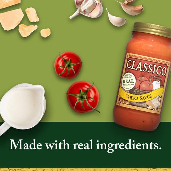 A creamy vodka sauce, just how you like it. Classico Vodka Sauce Pasta Sauce is packed with tomatoes, cream, cheese and a splash of vodka. Our vodka sauce is easy to prepare and offers a rich, flavorful taste. Made with real ingredients, our sauce has a hearty flavor. Simply simmer and serve our sauce with your favorite meal. Use our red sauce for penne alla vodka, risotto, lasagna or grilled chicken pasta. You can even try our sauce as a pizza sauce for homemade pizza or a dipping sauce for garlic bread. Be sure to refrigerate our 24-ounce jar of sauce after opening. Classico pasta sauce has a flavor for everyone in your family, from Vodka Sauce Pasta Sauce to Spicy Tomato & Basil Pasta Sauce. Make it yours, for your homemade dish.
