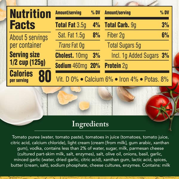 Tomato Puree (water, Tomato Paste), Diced Tomatoes In Juice (tomatoes, Tomato Juice, Citric Acid, Calcium Chloride), Cream (from Milk), Water, Vodka, Contains Less Than 2% Of Parmesan Cheese (cultured Part-skim Milk, Salt, Enzymes), Milk, Sugar, Salt, Onions, Olive Oil, Basil, Garlic, Xanthan Gum, Lactic Acid, Spices, Butter (cream, Salt), Sodium Phosphates, Cheese Cultures, Enzymes.