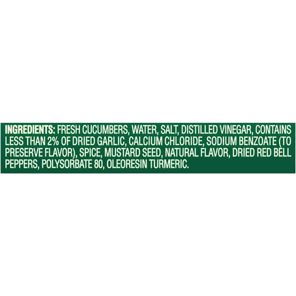 Fresh Cucumbers, Water, Salt, Distilled Vinegar, Contains Less Than 2% Of Dried Garlic, Calcium Chloride, Sodium Benzoate (to Preserve Flavor), Spice, Mustard Seed, Natural Flavor, Dried Red Bell Peppers, Polysorbate 80, Oleoresin Turmeric