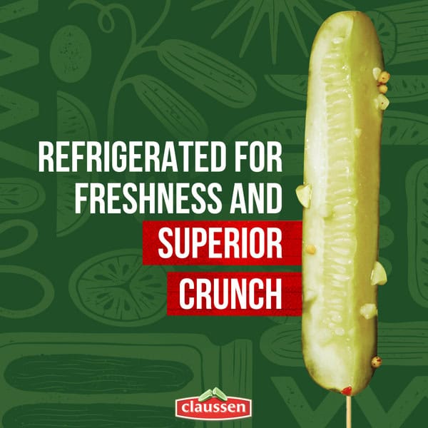 With a sweet and juicy kick, Claussen Kosher Dill Pickle Spears are full of flavor and crunch. Our Claussen pickle spears are crafted with fresh cucumbers picked straight from the vine and refrigerated for our classic Claussen crunch. Pickled with a unique spice blend of turmeric, garlic and red pepper, our dill pickle spears are great served on the side with your burgers, hot dogs and sandwiches. Claussen pickles are vegan, Kosher Certified and a fat free food, making them a delicious snack. They also make a great addition to your charcuterie board. Keep our 24-ounce resealable jar of pickle spears refrigerated. Whether you enjoy pickle chips or spears, slices or wholes, you can’t beat Claussen’s mouthwatering crunch.