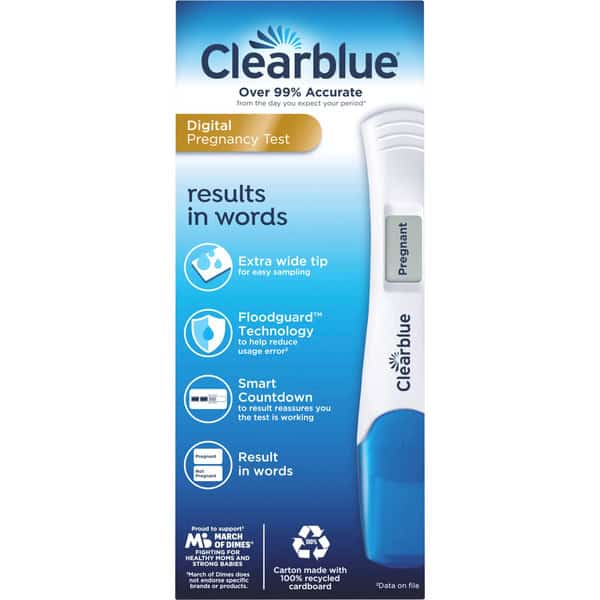 The Clearblue Digital Pregnancy Test with Smart Countdown (Prueba de embarazo Digital Clearblue con cuenta regresiva inteligente) is the only test that has a unique progress indicator that counts down to the result and gives you confidence every step of the way until your result is digitally displayed in words. The Clearblue Digital Pregnancy Test with Smart Countdown with its wide tip makes it easy to take the test accurately. The unique Floodguard Technology helps reduce the #1 reported cause of user error by over 70%(4) by keeping excess urine from flooding the test strip. The Clearblue Digital Pregnancy Test with Smart Countdown gives you accuracy and reassurance while you wait for your result.