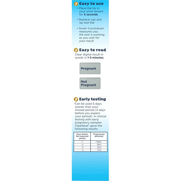 (1) Easy to Use: Place the tip in your urine stream for 5 seconds. Replace cap and lay test flat. Smart countdown reassures you the test is working as you wait for your result. (2) Easy to Read: Clear digital result in words in 1-3 minutes. Pregnant. Not pregnant. (3) Early Testing: Can be used 5 days sooner than your missed period (4 days before you expect your period). In clinical testing with early pregnancy samples Clearblue gave the following results: Days before the expected period: -1; Pregnancy detected: greater than 99%. Days before the expected period: -2; Pregnancy detected: 98%. Days before the expected period: -3; Pregnancy detected: 95%. Days before the expected period: -4; Pregnancy detected: 75%. Read package insert before use. English and Spanish instructions inside.