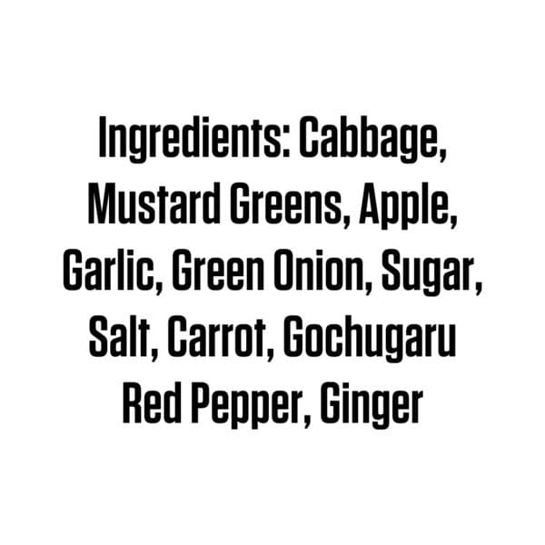 Cabbage, Mustard Greens, Apple, Garlic, Green Onion, Sugar, Salt, Carrot, Gochugaru Red Pepper, Ginger.