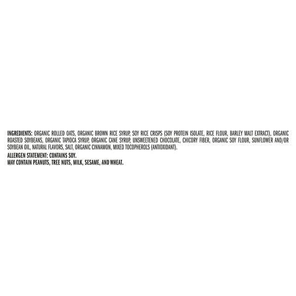 Organic Rolled Oats, Organic Brown Rice Syrup, Soy Rice Crisps (soy Protein Isolate, Rice Flour, Barley Malt Extract), Organic Roasted Soybeans, Organic Tapioca Syrup, Organic Cane Syrup, Unsweetened Chocolate, Chicory Fiber, Organic Soy Flour, Sunflower And/or Soybean Oil, Natural Flavors, Salt, Organic Cinnamon, Mixed Tocopherols (antioxidant). Allergen Statement- Contains Soy
