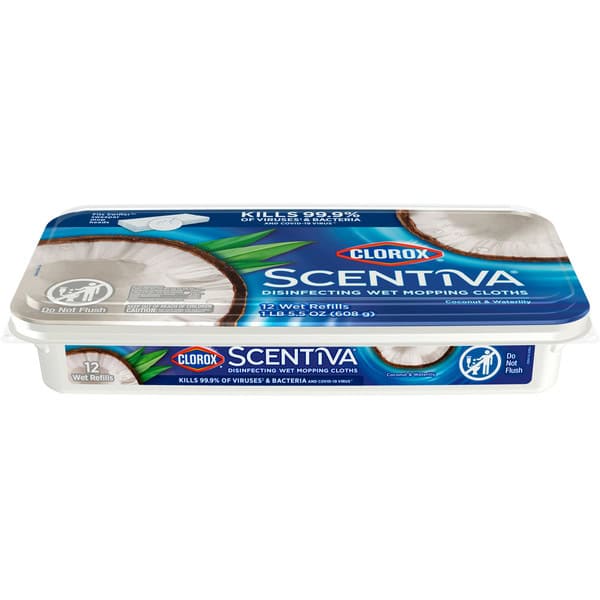 Clorox Scentiva Disinfecting Wet Mopping Cloths combine the trusted cleaning power of Clorox with the captivating scent of Coconut and Waterlily to transform your home. Clorox Scentiva scents are inviting blends that elevate your cleaning experience. Clorox Scentiva mopping cloths for floor cleaning eliminate 99.9% of viruses* and bacteria, including COVID-19** virus, while filling your home with long lasting scents. These Clorox wipes for mopping are bleach free and feature ultra textured fabric that traps 4X more particles, dirt and hair*** and prevent bacteria growth**** for 24 hours. *Pseudomonas aeruginosa, Salmonella enterica, Staphylococcus aureus, Escherichia coli O157:H7, Streptococcus pyogenes, Klebsiella pneumoniae, Influenza Virus Type A2, Influenza Virus Type B when used as directed on hard, nonporous surfaces. **Kills SARS-CoV-2 on hard, nonporous surfaces. ***vs Clorox Disinfecting wipes. ****Prevents odor causing bacteria on non food contact surfaces.