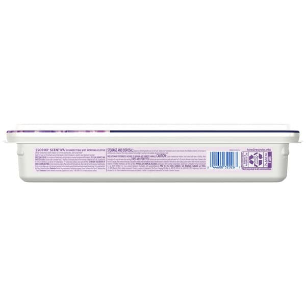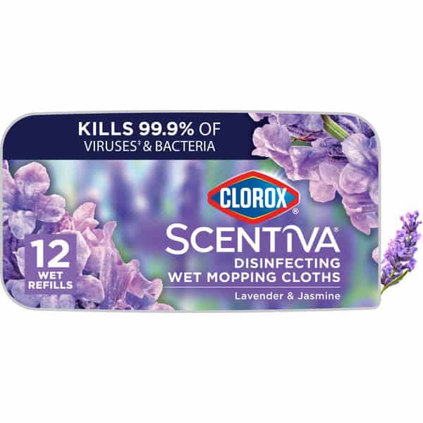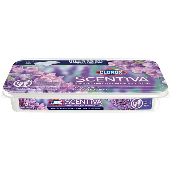 Clorox Scentiva Disinfecting Wet Mopping Cloths combine the trusted cleaning power of Clorox with the captivating scent of Lavender and Jasmine to transform your home. Clorox Scentiva scents are inviting blends that elevate your cleaning experience. Clorox Scentiva mopping cloths for floor cleaning eliminate 99.9% of viruses* and bacteria, including COVID-19** virus, while filling your home with long lasting scents. These Clorox wipes for mopping are bleach free and feature ultra textured fabric that traps 4X more particles, dirt and hair*** and prevent bacteria growth**** for 24 hours. Do not flush. *Pseudomonas aeruginosa, Salmonella enterica, Staphylococcus aureus, Escherichia coli O157:H7, Streptococcus pyogenes, Klebsiella pneumoniae, Influenza Virus Type A2, Influenza Virus Type B when used as directed on hard, nonporous surfaces. **Kills SARS-CoV-2 on hard, nonporous surfaces. ***vs Clorox Disinfecting wipes. ****Prevents odor causing bacteria on non food contact surfaces.