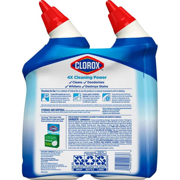 Clorox Toilet Bowl Cleaner with Bleach kills 99.9%, including COVID-19* Virus, of germs and whitens and brightens your toilet bowl with the trusted power of Clorox Bleach. This powerful bleach cleans your toilet bowl while it destroys tough stains, disinfects and eliminates odors with a refreshing Rain Clean Scent. The only toilet bowl cleaner with Clorox Bleach, it cleans and leaves toilets sparkling and bright. Clorox Toilet Bowl Cleaner with Bleach deodorizes as it whitens and brightens. Uniquely angled, this dispensing nozzle makes it easy to tackle hard-to-reach areas under the bowl rim with a simple squeeze of the bottle. Flush toilet. Apply six ounces under and around the rim. Scrub entire bowl. Let sit for 5 minutes. Flush toilet. Disinfect and get your toilet squeaky clean with Clorox Toilet Bowl Cleaner with Bleach.