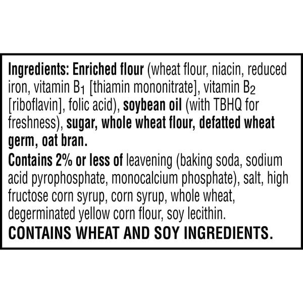Enriched Flour (wheat Flour, Niacin, Reduced Iron, Vitamin B₁ [thiamin Mononitrate], Vitamin B₂ [riboflavin], Folic Acid), Soybean Oil (with Tbhq For Freshness), Sugar, Whole Wheat Flour, Defatted Wheat Germ, Oat Bran, Contains 2% Or Less Of Leavening (baking Soda, Sodium Acid Pyrophosphate, Monocalcium Phosphate), Salt, High Fructose Corn Syrup, Corn Syrup, Whole Wheat, Degerminated Yellow Corn Flour, Soy Lecithin