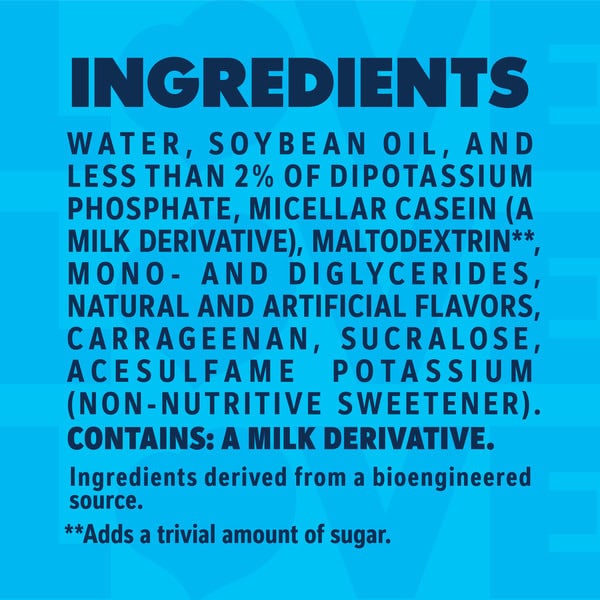 Water, Corn Syrup**, Vegetable Oil (high Oleic Soybean And/or High Oleic Canola), Less Than 2% Of Micellar Casein (a Milk Derivative)***, Maltodextrin, Mono- And Diglycerides, Dipotassium Phosphate, Natural And Artificial Flavor, Carrageenan, Sucralose, Acesulfame Potassium (non-nutritive Sweetener), **adds A Trivial Amount Of Sugar, ***not A Source Of Lactose