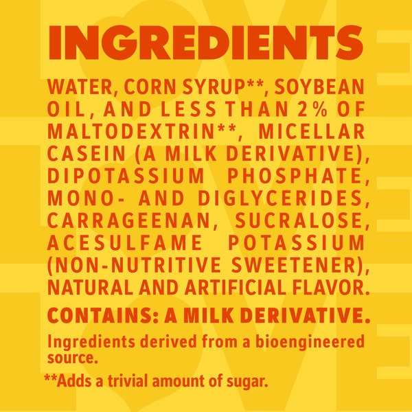 Water, Corn Syrup**, Soybean Oil, And Less Than 2% Of Maltodextrin**, Micellar Casein (a Milk Derivative), Dipotassium Phosphate, Mono- And Diglycerides, Carrageenan, Sucralose, Acesulfame Potassium (non-nutritive Sweetener), Natural And Artificial Flavor.