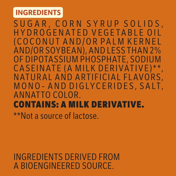 Sugar, Hydrogenated Vegetable Oil (coconut And/or Palm Kernel And/or Soybean), Corn Syrup Solids, And Less Than 2% Of Sodium Caseinate (a Milk Derivative)**, Mono- And Diglycerides, Dipotassium Phosphate, Sodium Aluminosilicate, Salt, Natural And Artificial Flavor.