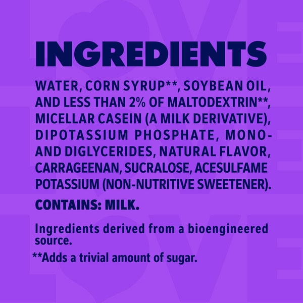 Water, Corn Syrup**, Soybean Oil, And Less Than 2% Of Maltodextrin**, Micellar Casein (a Milk Derivative), Dipotassium Phosphate, Mono- And Diglycerides, Natural Flavor, Carrageenan, Sucralose, Acesulfame Potassium (non-nutritive Sweetener).