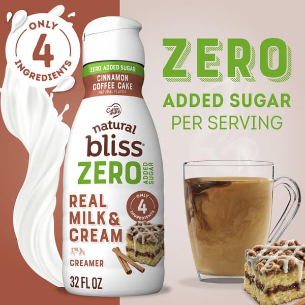 • DELICIOUS COFFEE CREAMER: Enjoy a delightful coffee experience with our Coffee mate natural bliss Cinnamon Coffee Cake Flavored Coffee Creamer with zero added sugar. This flavored liquid creamer is carefully crafted to deliver a rich texture that will elevate your coffee flavor