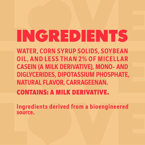 Water, Corn Syrup Solids, Soybean Oil, And Less Than 2% Of Micellar Casein (a Milk Derivative), Mono- And Diglycerides, Dipotassium Phosphate, Natural Flavor, Carrageenan