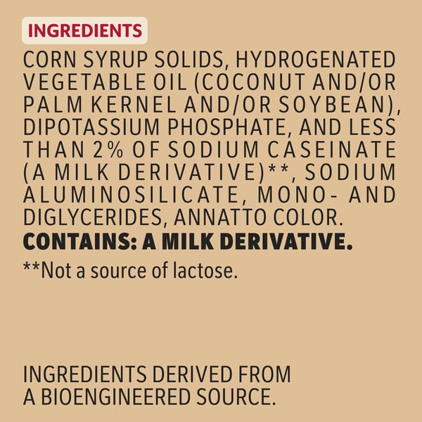 Corn Syrup Solids, Hydrogenated Vegetable Oil (coconut And/or Palm Kernel And/or Soybean), Dipotassium Phosphate, And Less Than 2% Of Sodium Caseinate (a Milk Derivative)**, Sodium Aluminosilicate, Mono – And Diglycerides, Annatto Color. **not A Source Of Lactose.