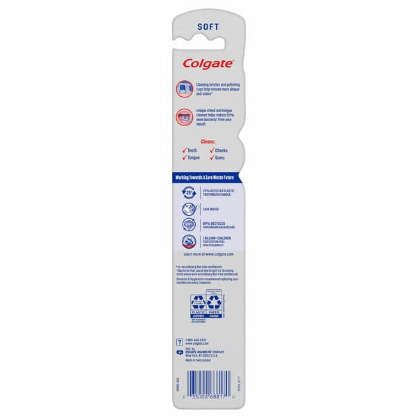 The Colgate 360⁰ adult full head toothbrush is designed with soft cleaning bristles and polishing cups that help remove more plaque and stains than an ordinary flat-trim toothbrush. This manual toothbrush has an ergonomic handle design and a unique cheek & tongue cleaner that help reduce 151% more bacteria that cause bad breath versus brushing teeth alone with an ordinary flat-trim toothbrush.