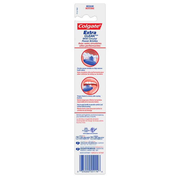 Colgate Extra Clean Full Head Medium Toothbrush is designed with circular power bristles to help remove tooth stains. Its cleaning tip bristles effectively reach and clean back teeth and between teeth. This manual toothbrush also has an easy-to-grip handle to provide comfort and control while brushing. Remember to change your toothbrush every 3 months.