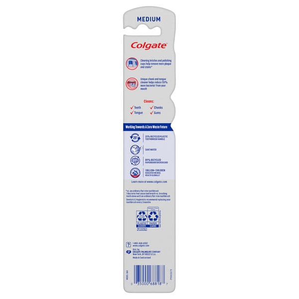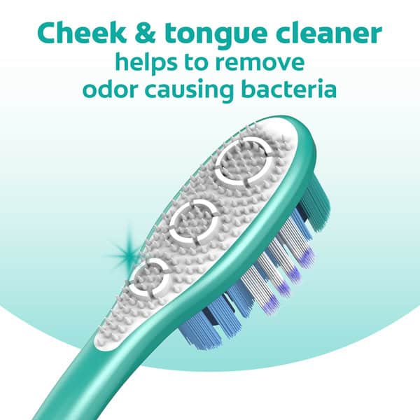 The Colgate 36⁰ adult toothbrush reduces 151% more bacteria that cause bad breath vs. brushing teeth alone with an ordinary flat-trim toothbrush. This toothbrush features medium cleaning bristles and polishing cups that help remove more plaque and stains and a unique cheek & tongue cleaner.
