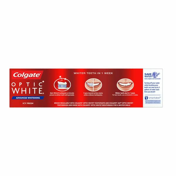 Misc: Enamel safe. Whiter teeth in 1 week. Goes beyond surface stain removal to deeply whiten. Optic White toothpaste is clinically proven to whiten teeth with peroxide. It goes beyond surface stains unlike ordinary toothpastes. Whiter teeth start in 1 week. Save water. www.colgate.com/savewater. Turning off your water while brushing your teeth can save up to 4 gallons of water each time you brush! Gluten free. www.colgateopticwhite.com. Made in Mexico.