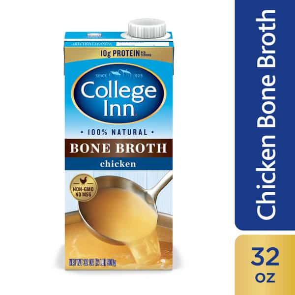 COLLEGE INN 100% Natural Chicken Bone Broth is made with the highest quality ingredients, giving this chicken stock the rich flavor that elevates any homemade meal. This Non-GMO* soup base features no artificial flavors, preservatives or added MSG** for a chicken broth you and your family can trust. Enjoy the delicious taste of simmered chicken and farm grown vegetables in this COLLEGE INN chicken broth. From savory chicken noodle soup to easy one-pot meals like white chicken chili, chicken and rice, and other family favorites, use this soup stock to create homemade meals that bring people together. Each carton of COLLEGE INN bone broth features a twist off, resealable top, so you can easily reuse this chicken broth for your next home cooked meal. Keep unused chicken stock in the refrigerator after opening. Make every dish even more delicious with COLLEGE INN Chicken Bone Broth. *Ingredients of the types used in this product are not genetically modified. **A small amount of glutamate occurs naturally in yeast extract.