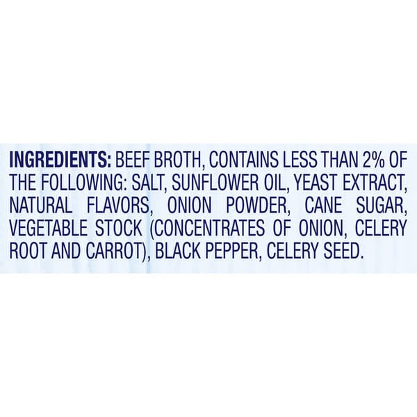 Beef Broth, Contains Less Than 2% Of The Following: Salt, Sunflower Oil, Yeast Extract, Natural Flavors, Onion Powder, Cane Sugar, Vegetable Stock (concentrates Of Onion, Celery Root And Carrot), Black Pepper, Celery Seed