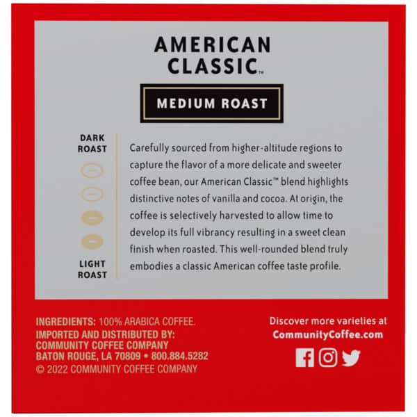Carefully sourced from higher-altitude regions to capture the flavor of a more delicate and sweeter coffee bean, our American Classicâ„¢ blend highlights distinctive notes of vanilla and cocoa. At origin, the coffee is selectively harvested to allow time to develop its full vibrancy resulting in a sweet clean finish when roasted. This well-rounded blend truly embodies a classic American coffee taste profile.