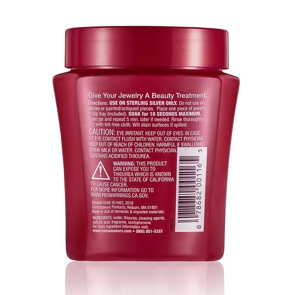 Directions: Use on sterling silver only. Do not use on stones or painted/aniqued pieces. Place one piece of jewelry in dip tray (included). Soak for 10 seconds maximum. Open jar and repeat 5 min. later if needed. Rinse thoroughly. Dry with lint-free cloth. Will stain surfaces if spilled.