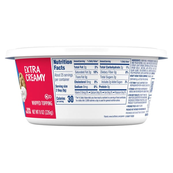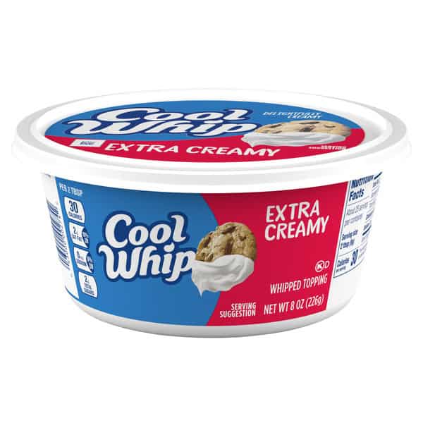 Cool and creamy, delicious and dreamy, Cool Whip Extra Creamy Whipped Topping is the dollop that makes desserts extra special. So why not go extra creamy? Light and fluffy, it adds a cloud of perfection to everything from pretty pies to sensational ice cream sundaes. Cool Whip is a one-of-a-kind extra creamy whipped topping. Each serving contains 30 calories and 2 grams of fat. Add our extra creamy whip to your favorite dessert creations like banana pudding, strawberry shortcakes, cookies and parfaits. Put the playful topping on your hot chocolate and milkshakes or use as a delightful dip for fresh fruit. Our extra creamy whipped topping is the same classic delight you know and love, with an extra creamy texture that takes desserts to the next level. Keep our frozen whipped topping in the freezer until ready to thaw and enjoy. Our 8-ounce tub of Cool Whip Extra Creamy Whipped Topping stays Fridge Fresh for two weeks. Just dollop and enjoy!