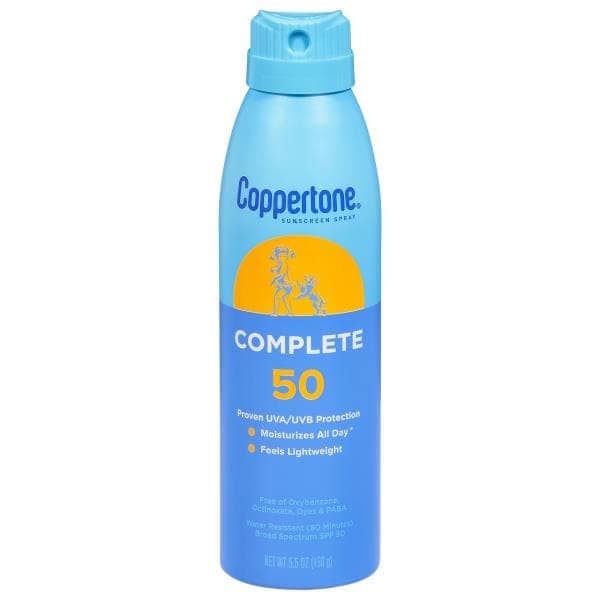 Coppertone Complete Sunscreen Spray provides everyday sun protection for the whole family. With a multi-benefit formula that helps your skin in more ways than one, this spray on sunscreen protects you from the sun with a durable and water resistant sunscreen formula (80 minutes). Coppertone Complete Sunscreen Spray offers broad spectrum UVA/UVB protection that feels lightweight and moisturizes all day.* This sunscreen spray SPF 50 has a continuous sprayer for application on any angle. It is also free from oxybenzone, octinoxate, PABA, phthalates and dyes. Each sunscreen Coppertone creates follows a tradition of trusted, quality sun protection products. Coppertone has been providing continuous innovation for more than 75 years, and is voted the most trusted sunscreen brand.** *for sun protection, use as directed **Voted Most Trusted Sunscreen brand by American shoppers based on the 2022 BrandSpark American Trust Study.