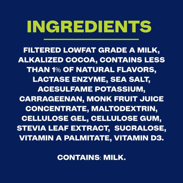 Filtered Lowfat Grade A Milk, Alkalized Cocoa, Contains Less Than 1% Of Natural Flavors, Lactase Enzyme, Sea Salt, Acesulfame Potassium, Carrageenan, Monk Fruit Juice Concentrate, Maltodextrin, Cellulose Gel, Cellulose Gum, Stevia Leaf Extract, Sucralose, Vitamin A Palmitate, Vitamin D3