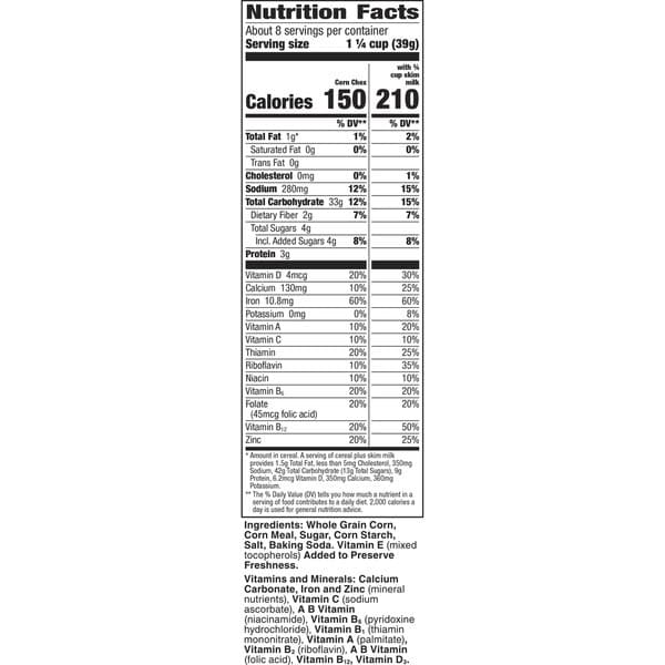 Whole Grain Corn, Corn Meal, Sugar, Corn Starch, Salt, Baking Soda, Vitamin E (mixed Tocopherols) Added To Preserve Freshness, Vitamins And Minerals: Calcium Carbonate, Iron And Zinc (mineral Nutrients), Vitamin C (sodium Ascorbate), A B Vitamin (niacinamide), Vitamin B₆ (pyridoxine Hydrochloride), Vitamin B₁ (thiamin Mononitrate), Vitamin A (palmitate), Vitamin B₂ (riboflavin), A B Vitamin (folic Acid), Vitamin B₁₂, Vitamin D₃