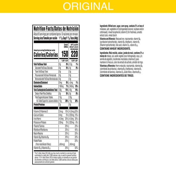 Milled Corn, Sugar, Corn Syrup, Contains 2% Or Less Of Molasses, Salt, Vegetable Oil (hydrogenated Coconut, Soybean And/or Cottonseed), Mixed Tocopherols (vitamin E) For Freshness, Annatto Extract Color, Wheat Starch. Vitamins And Minerals: Reduced Iron, Niacinamide, Vitamin B6 (pyridoxine Hydrochloride), Vitamin B2 (riboflavin), Vitamin B1 (thiamin Hydrochloride), Folic Acid, Vitamin D3, Vitamin B12.