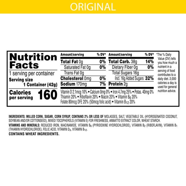 Milled Corn, Sugar, Corn Syrup, Contains 2% Or Less Of Molasses, Salt, Vegetable Oil (hydrogenated Coconut, Soybean And/or Cottonseed), Mixed Tocopherols (vitamin E) For Freshness, Annatto Extract Color, Wheat Starch, Vitamins And Minerals: Reduced Iron, Niacinamide, Vitamin B₆ (pyridoxine Hydrochloride), Vitamin B₂ (riboflavin), Vitamin B₁ (thiamin Hydrochloride), Folic Acid, Vitamin D₃, Vitamin B₁₂